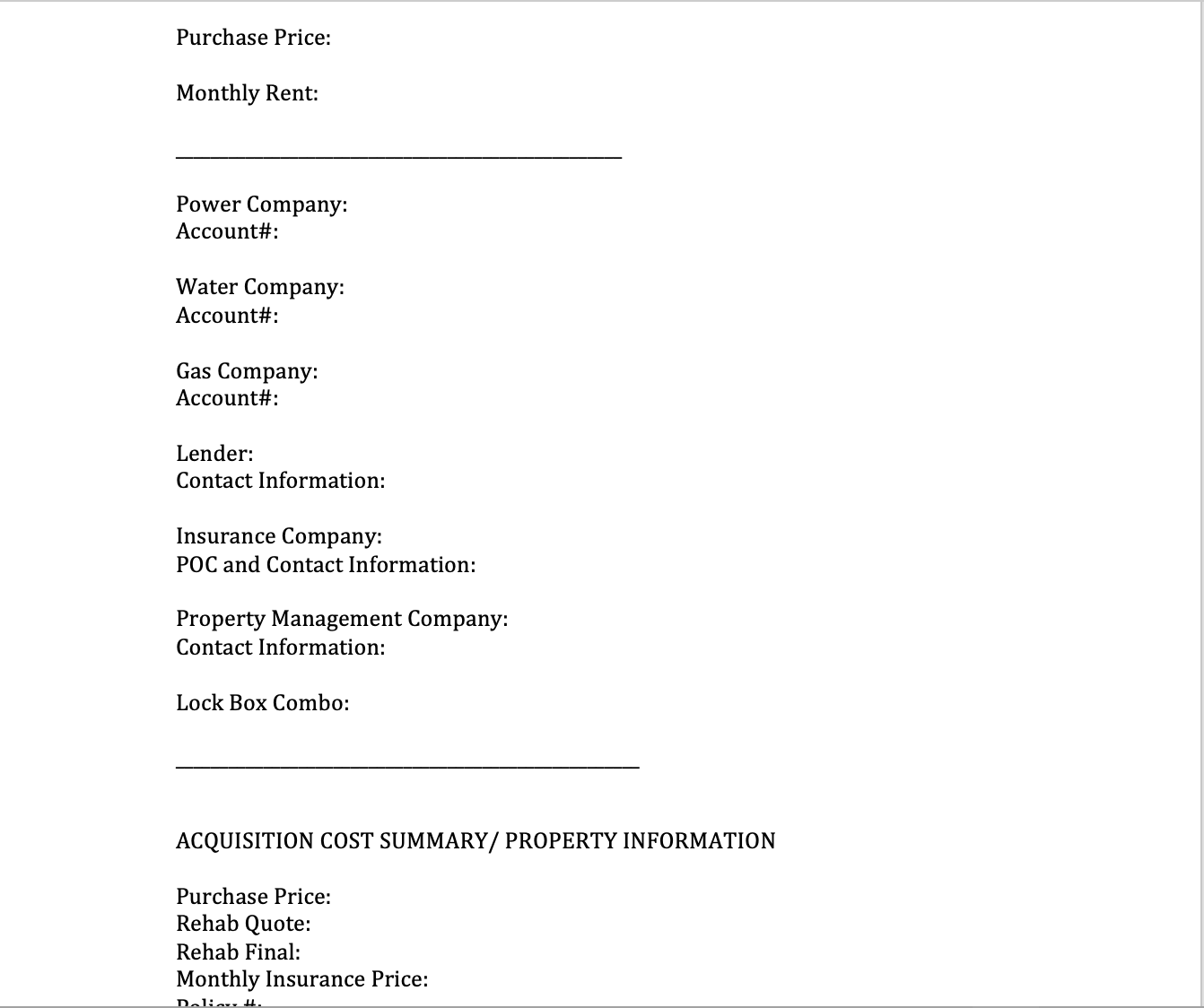 Keep track of EVERY piece of important information for your properties! This one-stop-document is what you need to keep all of that important info in one place. From contractor contact information, to refrigerator model #s, and insurance policy information. All of this key information will never get lost, and you'll have a detailed record of everyone who ever worked on your property, and every product that ever went into your property!